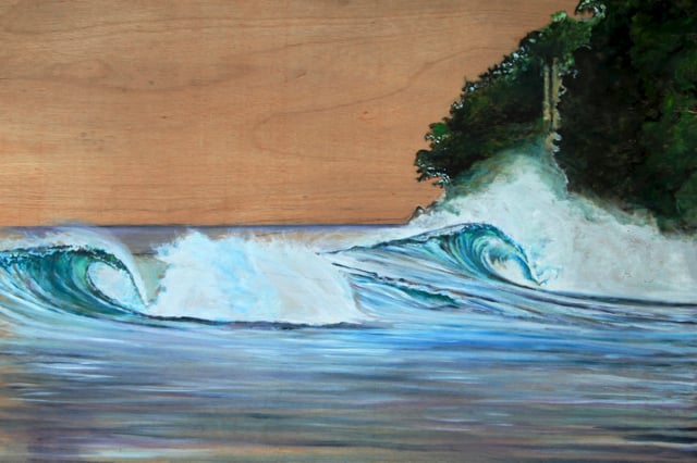 "Pasti And Lobang" is an original oil painting on wood created for the Surfing Village Resort in Indonesia. It was painted by Phil Goodrich on location in April of 2015 on the tiny island of Hilibala in North West Sumatra.