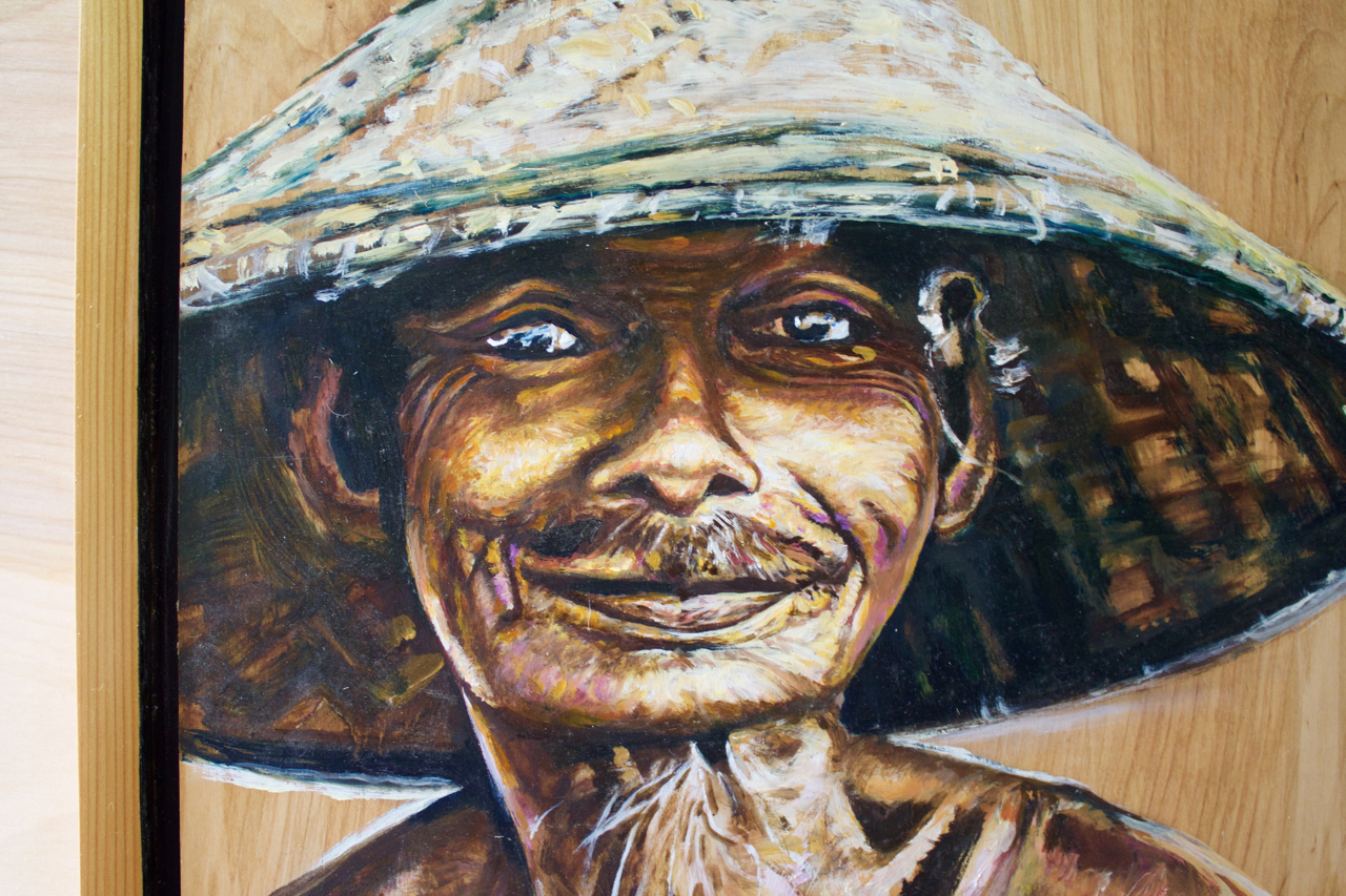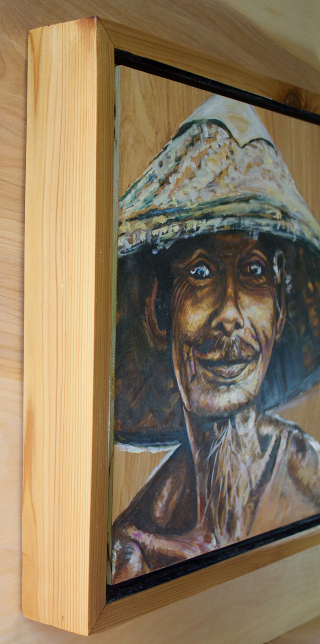 An original oil painting on birch plywood of a jolly, Indonesian man from Sumatra . Inspired by a photo from Brazilian photographer Harleyson Almeida. 12.5" x 16.5" the handmade birch frame with 5 layers of tung oil is 14.5" x 18.5" x 2.5"