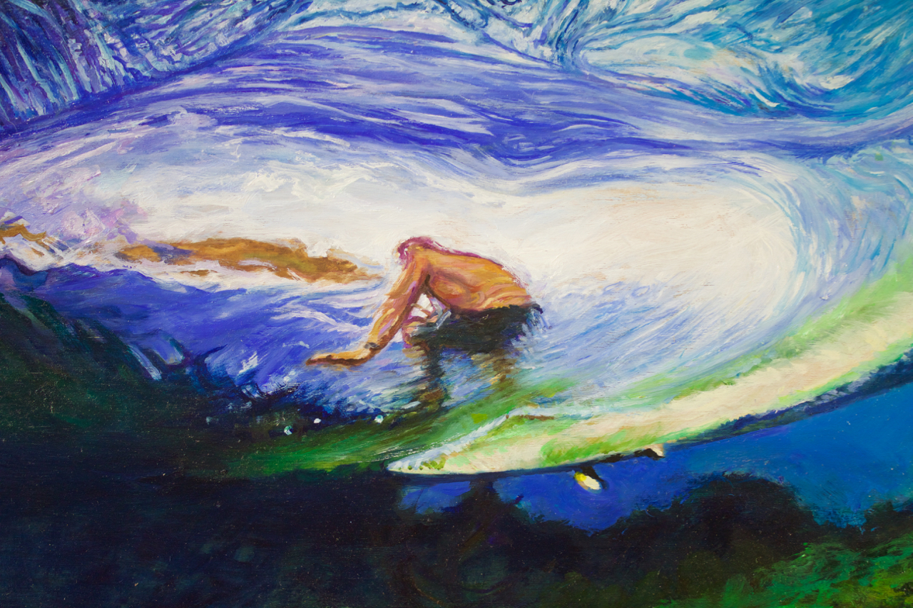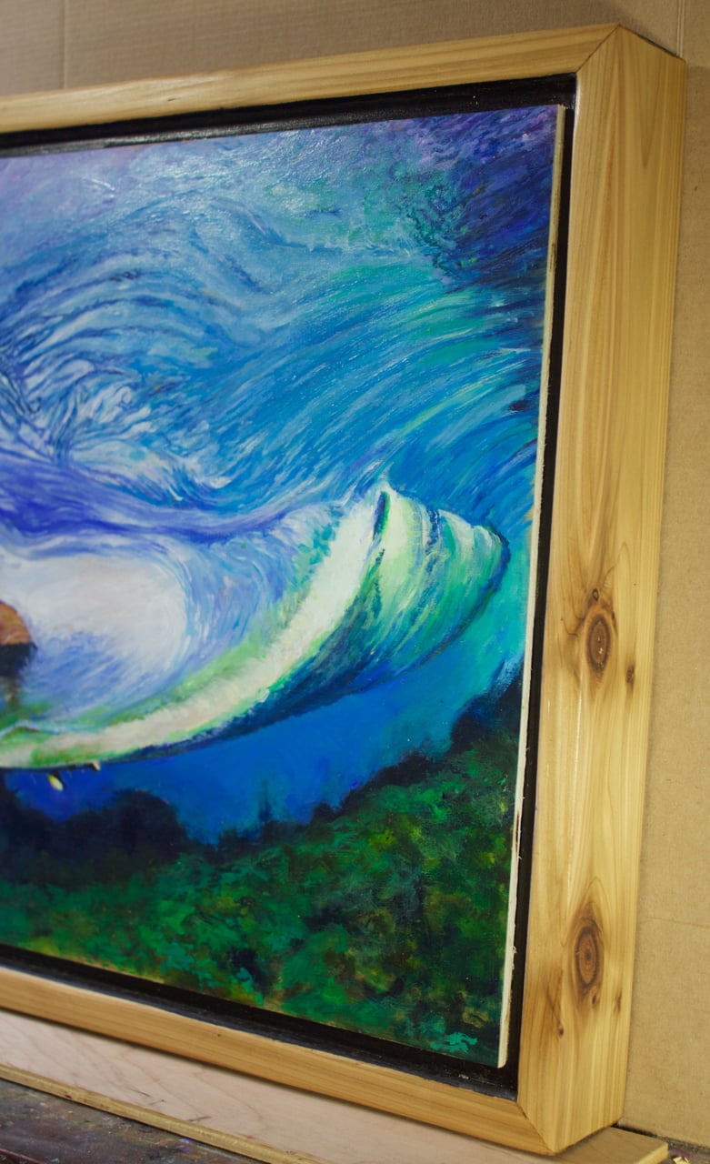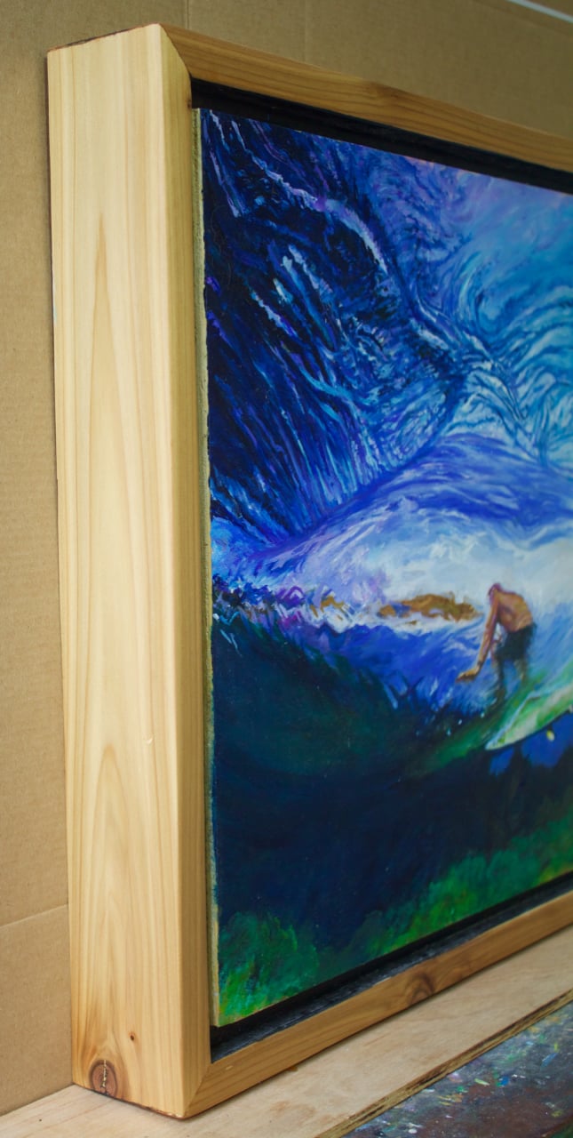 An original oil painting on birch plywood of Mick Fanning surfing in Tahiti . Inspired by a photo from Brazilian photographer Renato Tinoco. 15.5" x 21" x 2" handmade cedar wood frame polished with 5 layers of tung oil.