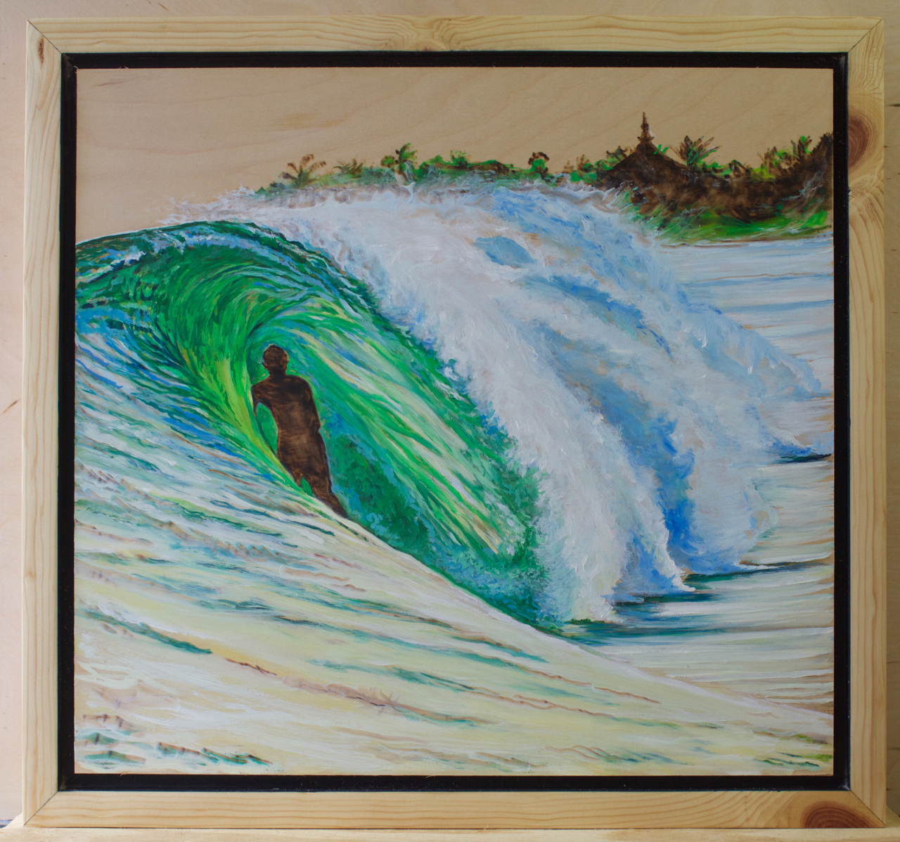 An original oil painting/ wood burn on birch plywood of John John Florence surfing in Indonesia . The figure of Florence was created by burning it into the wood. The wave is painted in oils. 16" x 17"x 2" handmade pine wood frame polished with 5 layers of tung oil.