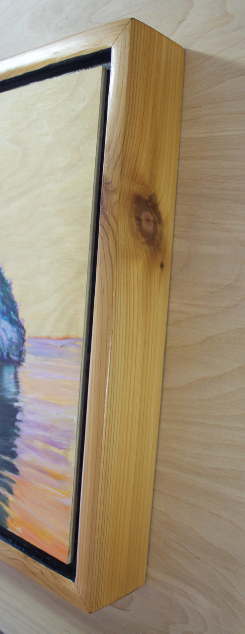A colorful depiction of a thick, hollow, Australian wave inspired by a photo from Ryan Pernofsky. Cedar frame handcrafted by the artist.
