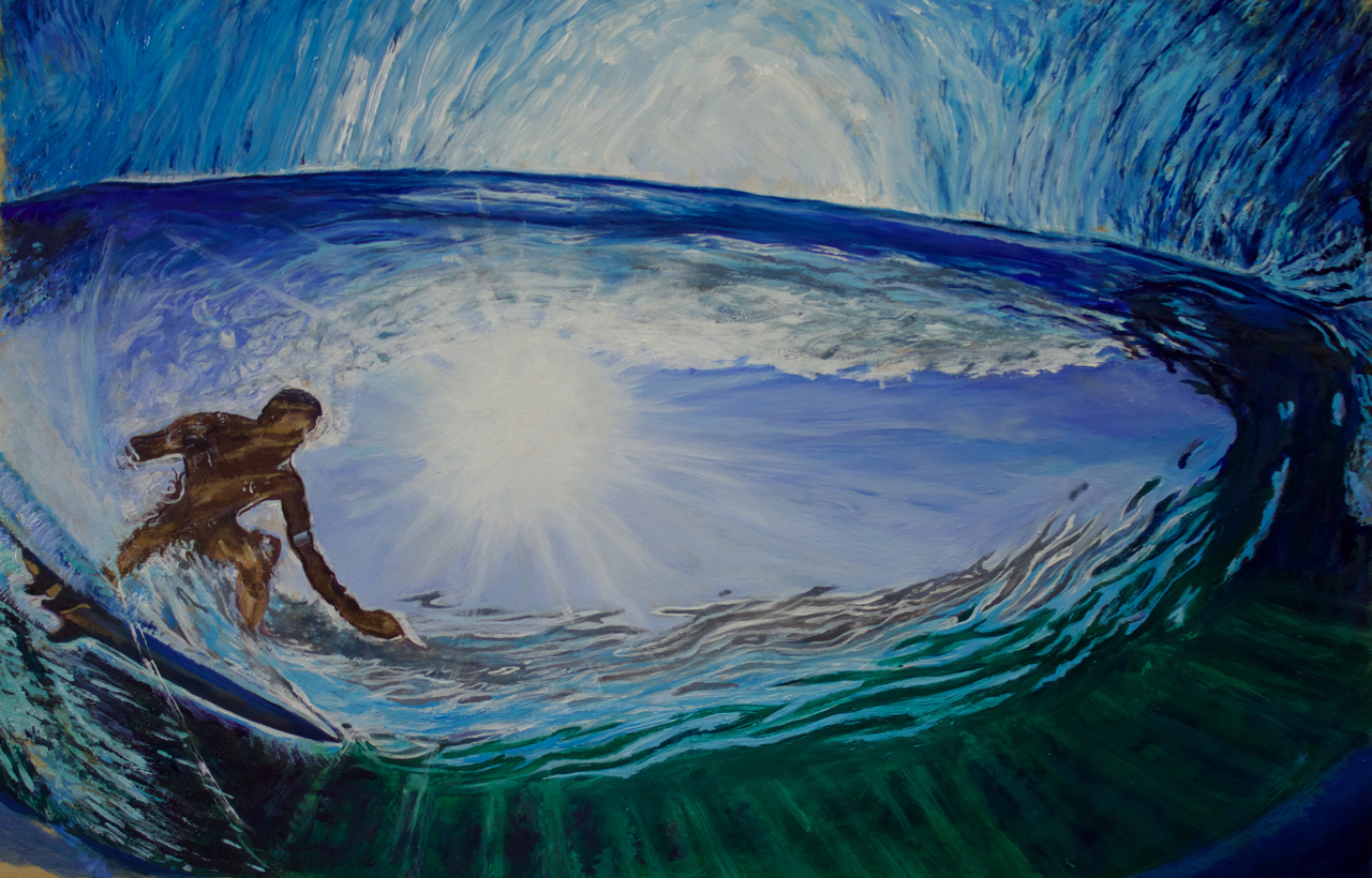 An original oil painting on birch plywood. 10.5" x 16." The wave is backdoor Pipeline as viewed from underwater and behind. It's inspired by the photography of LaserWolf.