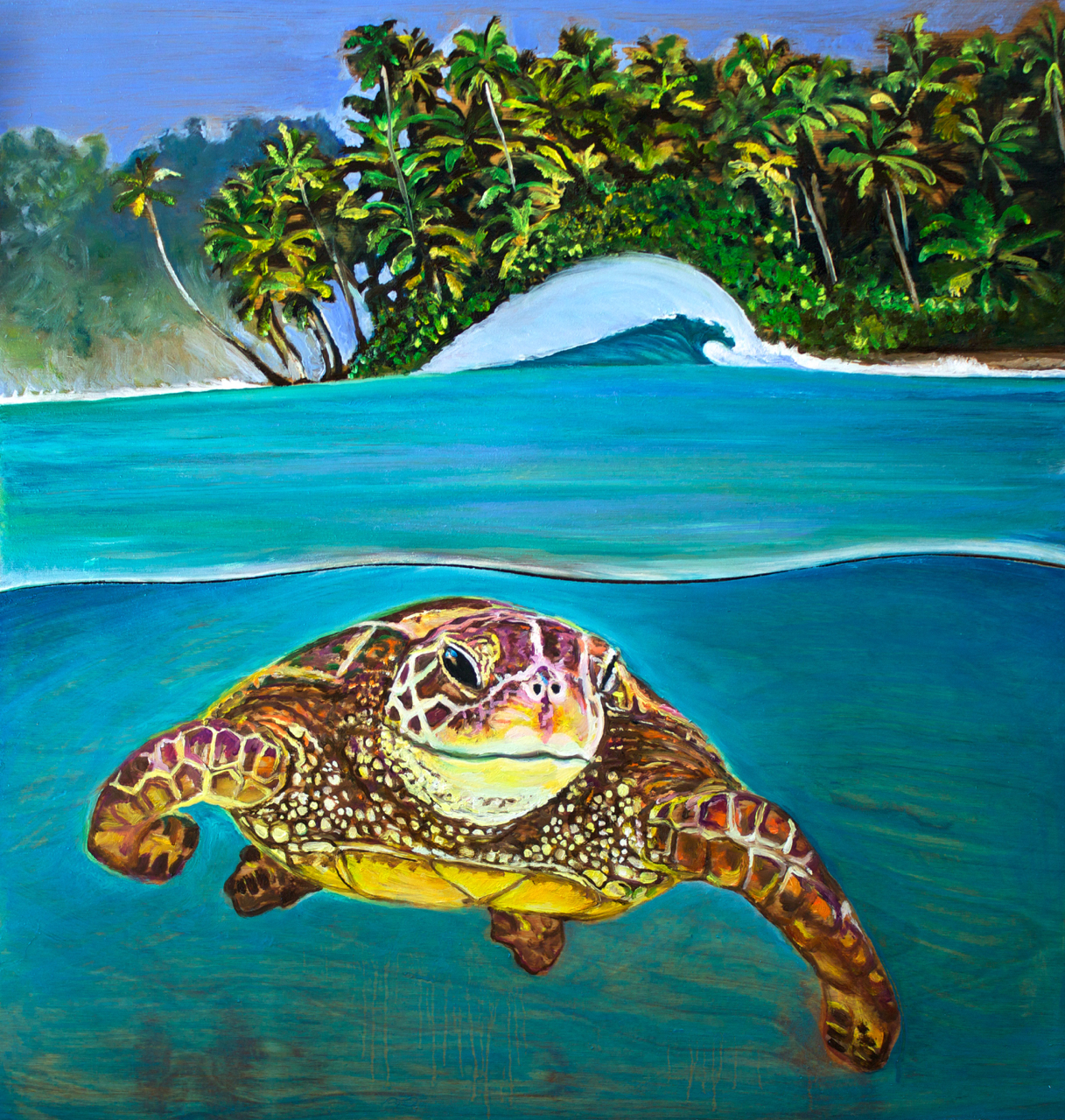 "Honu Below" was my original oil painting on wood based on a photo of Surfing Village Resort in Indonesia. "Honu Below" print measures 12" x 12" and is printed on archival quality photo paper.