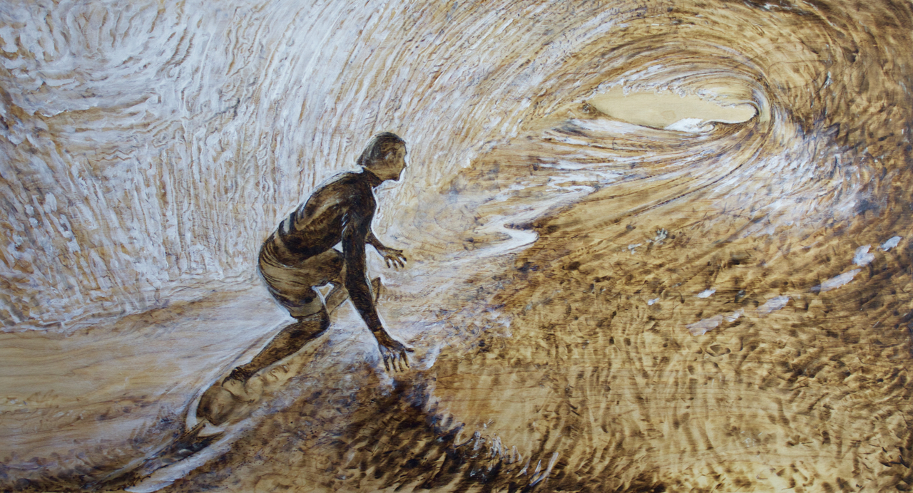 An original pyrography (wood burn) and oil painting on birch plywood. 13" x 24."