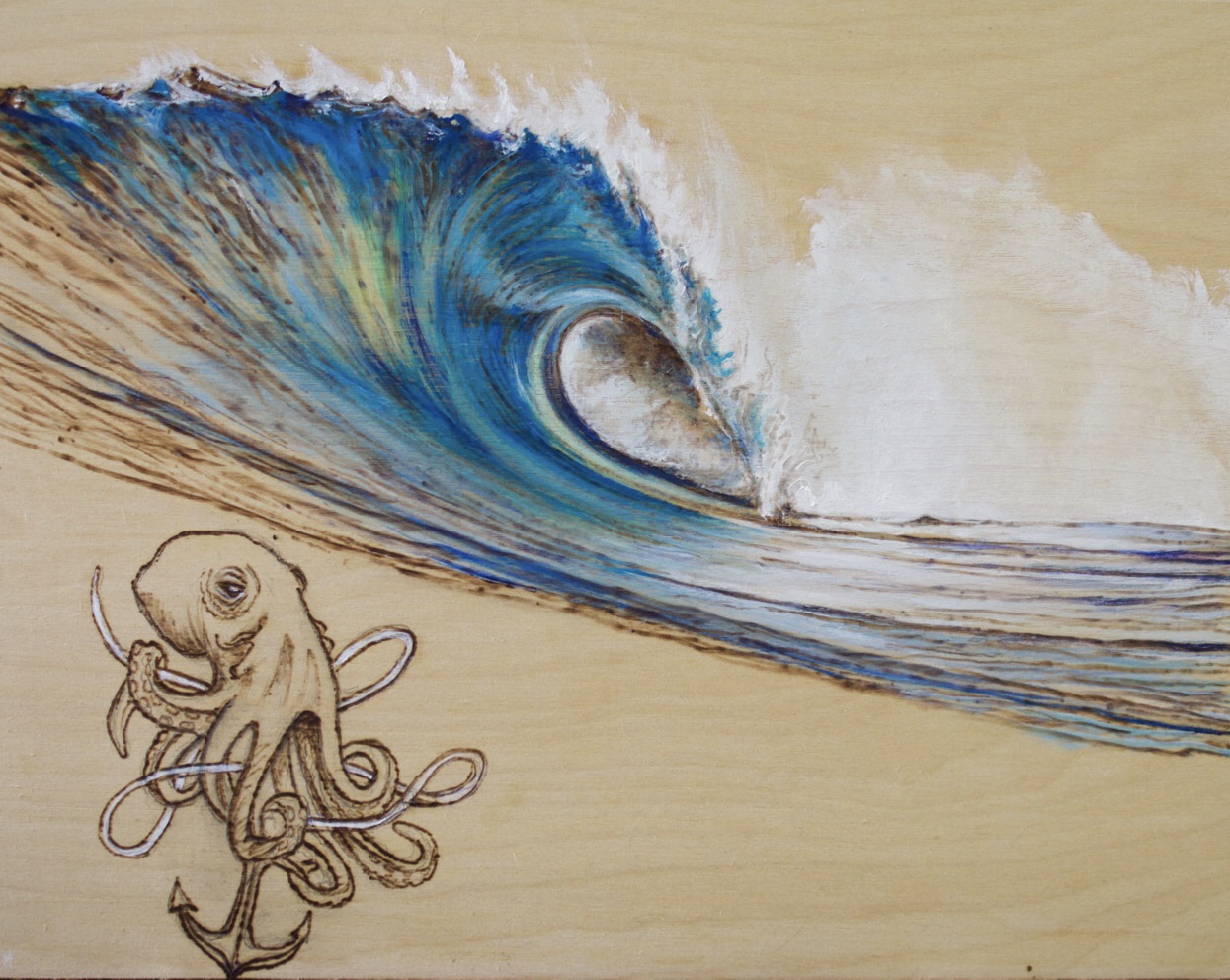 "Octo-Below" is a photo print of my original oil painting/pyrography on wood. 15”x15” archival quality ink on Kodak photo paper.